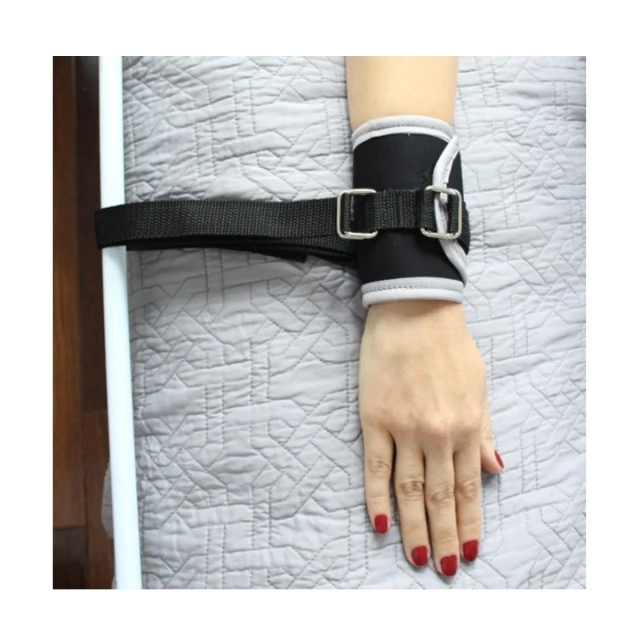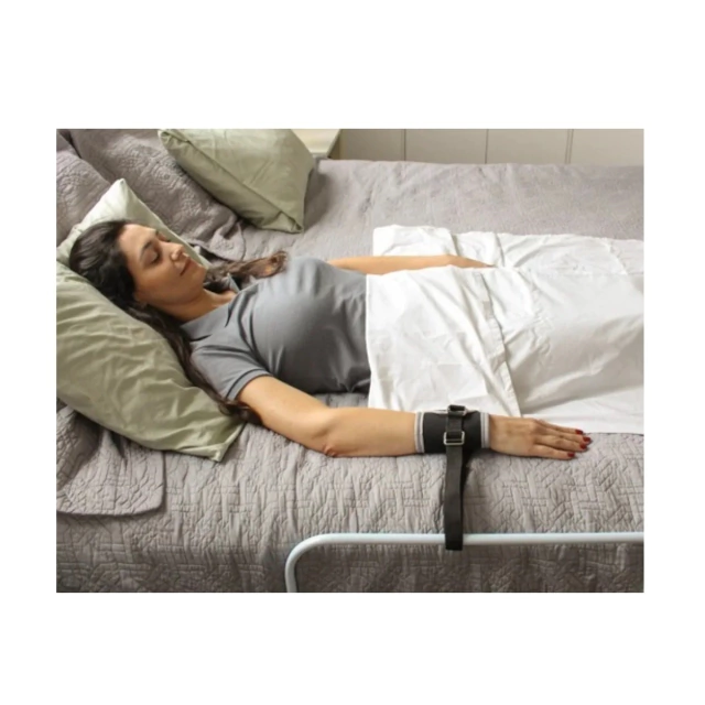 Confeccionado em tecido confortável e seguro, é ideal para segurar braços e pernas, ajustável através de tiras de velcro e se prende na cama com fitas de nylon e presilhas.